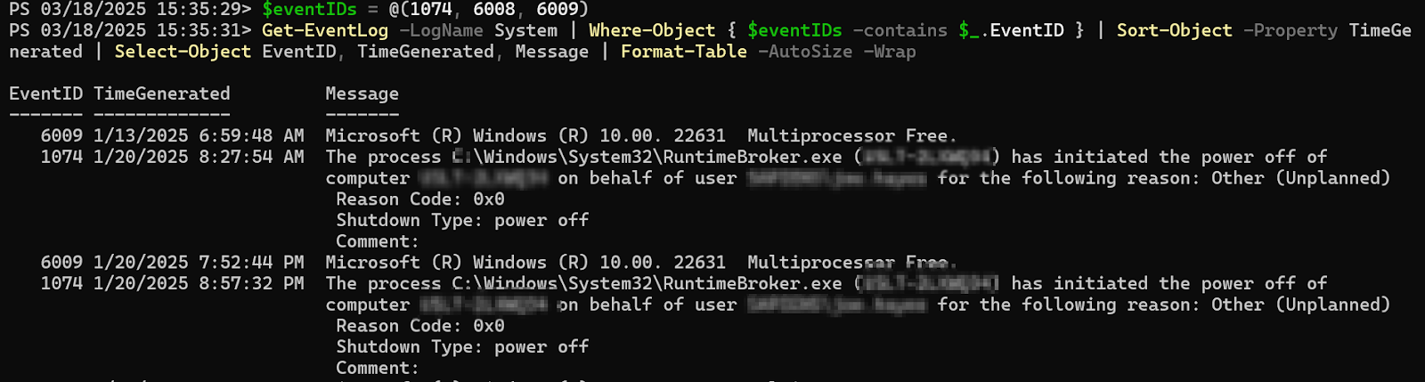 Get-EventLog -LogName System | Where-Object { $eventIDs -contains $_.EventID } | Sort-Object -Property TimeGenerated | Select-Object EventID, TimeGenerated, Message | Format-Table -AutoSize -Wrap